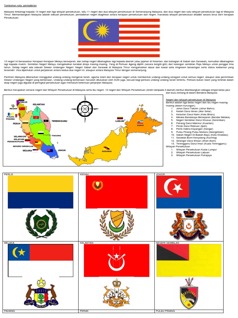 1.1 sejarah awal bendera di malaysia. Menyatakan lokasi malaysia di peta benua asia dan peta dunia. Lambang yang menjadi kebanggaan setiap anak malaysia. Bendera negeri sabah negeri di bawah bayu. 7 bendera kedah jata kedah anak bulan sabit berwarna hijau di bawah perisai kuning yang tanda negeri ini beragama islam, dan dilingkungi oleh jambangan padi berwarna kuning.